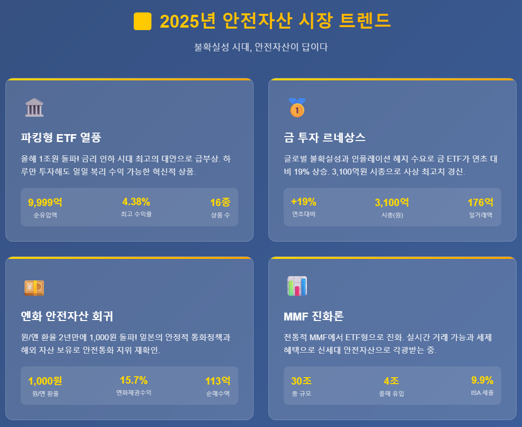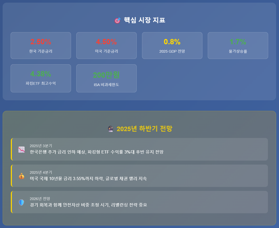 특히 대한민국의 기준 금리는 마지막으로 2.50%로 기록되며 금리 인하 사이클에 진입한 가운데, 기존의 예적금만으로는 인플레이션을 따라가기 어려운 현실입니다. 이런 시대에 자산을 지키면서도 꾸준한 수익을 창출할 수 있는 안전자산 투자 전략이 무엇보다 중요해졌습니다.