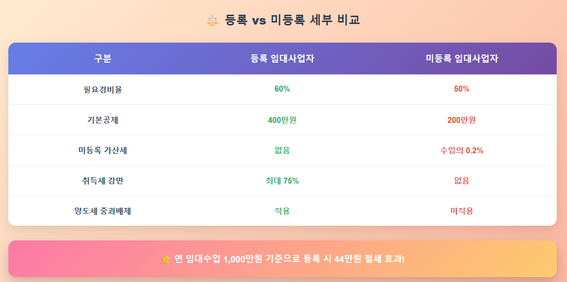 이 공식에서 등록 임대사업자와 미등록 임대사업자의 차이가 극명하게 드러납니다. 등록 임대사업자는 필요경비율 60%와 기본공제 400만원을 적용받는 반면, 미등록 임대사업자는 필요경비율 50%와 기본공제 200만원만 적용받습니다.
