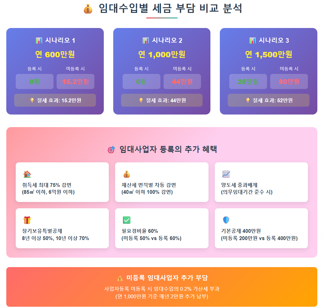 - 연 임대수입 1,000만원 시 등록 임대사업자는 세금 0원, 미등록 시 최대 60만원 이상 납부