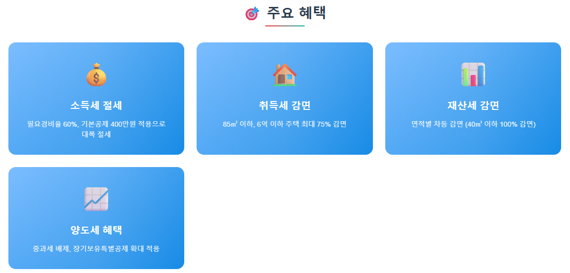85㎡ 이하, 기준시가 6억원 이하 주택의 경우 1호 임대시 75%, 2호 이상 임대시 50%의 취득세 감면 혜택을 받을 수 있습니다. 또한 임대형기숙사, 다가구주택, 공동주택에 대해 면적별로 재산세 감면 혜택도 제공됩니다.