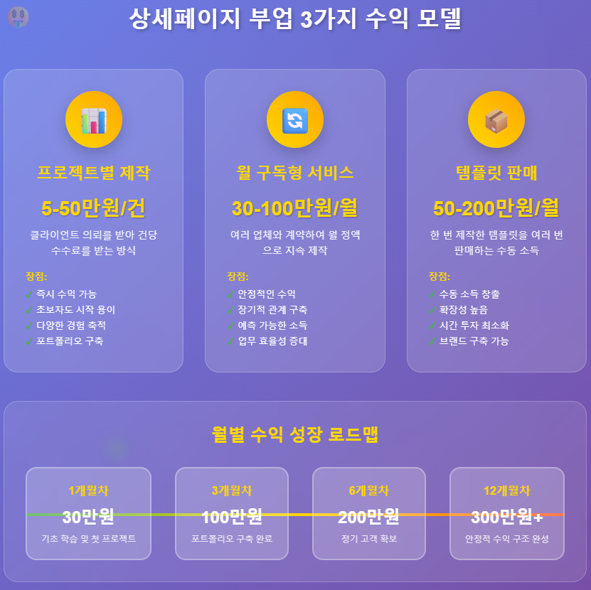 상세페이지 부업으로 돈을 버는 방법은 크게 3가지가 있습니다. 첫 번째는 '프로젝트별 제작 수수료' 모델입니다. 클라이언트로부터 상세페이지 제작 의뢰를 받아 건당 5만원에서 50만원까지 수수료를 받는 방식이에요. 초보자도 건당 5-10만원은 충분히 받을 수 있고, 실력이 늘면 20-50만원까지도 가능합니다. 크몽, 숨고, 프리랜서 등의 플랫폼을 통해 고객을 찾을 수 있죠. 두 번째는 '월 구독형 서비스' 모델입니다. 여러 업체와 계약을 맺어 월 정액으로 상세페이지를 지속적으로 제작해주는 방식이에요. 한 업체당 월 30-100만원 정도의 안정적인 수익을 올릴 수 있습니다. 세 번째는 '템플릿 판매' 모델입니다. 한 번 만든 고품질 상세페이지 템플릿을 여러 번 판매하는 방식으로, 수동 소득을 만들 수 있어요. 인기 있는 템플릿 하나가 월 50-200만원의 수익을 가져다주기도 합니다.