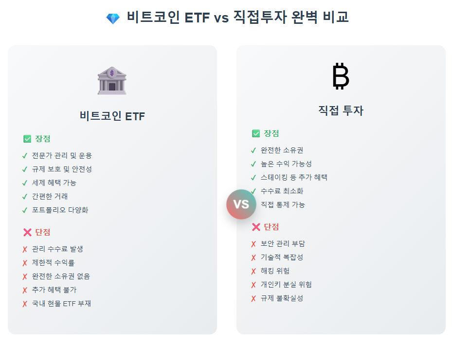 직접 투자의 장점은 완전한 소유권과 더 높은 수익 가능성입니다. 또한 스테이킹이나 에어드롭 등의 추가 혜택을 받을 수 있습니다. 하지만 보안 관리의 부담과 기술적 복잡성이 단점입니다.