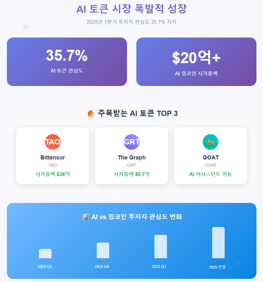 AI 토큰들이 2025년 1분기 글로벌 투자자 관심의 35.7%를 차지하며 밈코인의 27.1%를 넘어섰습니다. AI와 블록체인의 융합은 단순한 과장이 아닌 실질적인 혁신을 가져오고 있습니다.