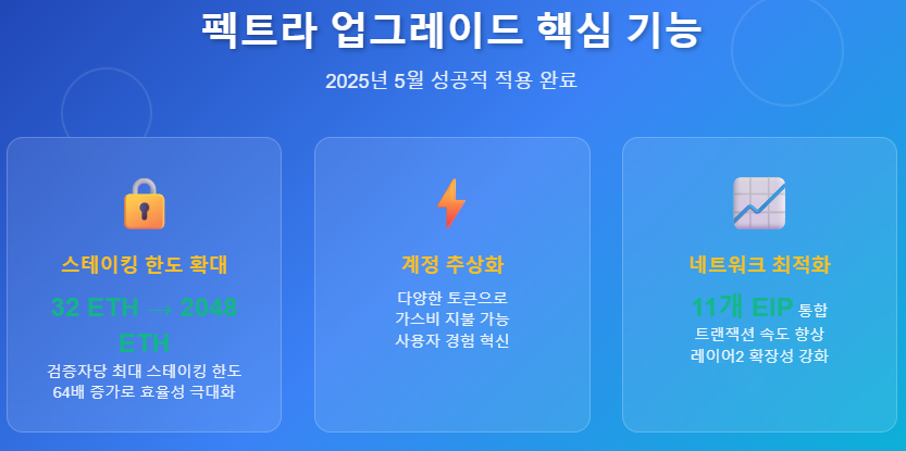 펙트라 업그레이드는 총 11가지 이더리움 개선 제안(EIP)을 통합하여 네트워크의 전반적인 성능을 향상시켰다. 가장 주목받는 기능 중 하나는 EIP-7702를 통한 계정 추상화로, 사용자들이 이더리움 외의 다른 토큰으로도 가스비를 지불할 수 있게 되었다. 이는 사용자 경험을 혁신적으로 개선하는 변화로, 기존에 복잡했던 이더리움 사용 방식을 대폭 간소화했다.