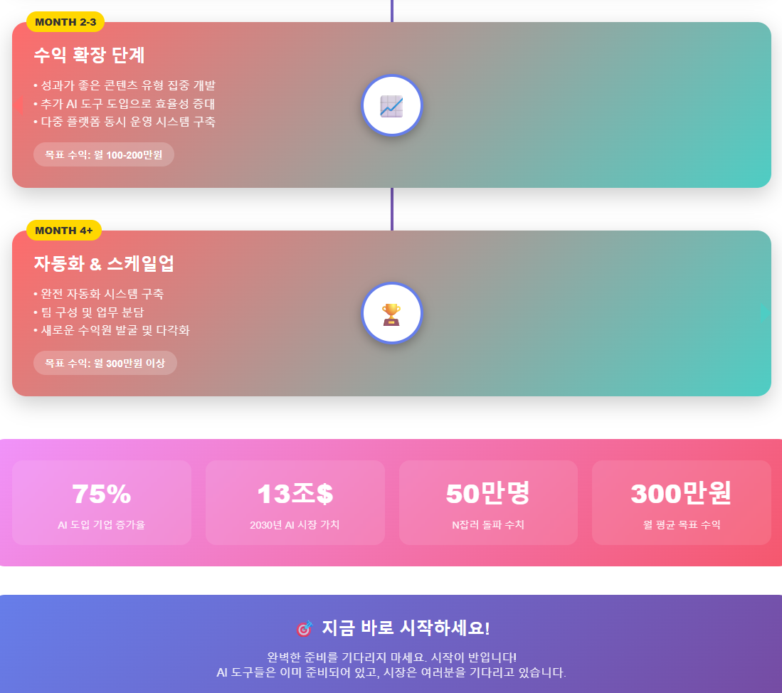 기억하세요: 시작이 반입니다. 완벽하게 준비되기를 기다리기보다는 지금 당장 첫 걸음을 내딛으세요. AI 도구들은 이미 준비되어 있고, 시장은 여러분을 기다리고 있습니다.