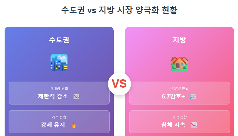 반면 지방의 경우 미분양 해소는 여전히 요원한 상황입니다. 8월 말 기준 전국 미분양 주택은 6만 7천 호를 넘어서며, 이 중 85% 이상이 지방에 집중되어 있습니다. 정부 대책이 수도권 중심으로 설계되면서 지방은 상대적으로 소외되는 결과를 낳았습니다.